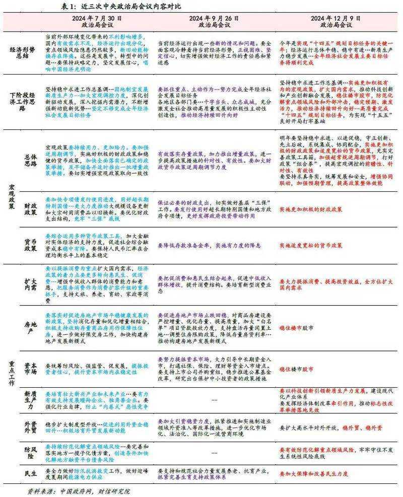 中央政治局会议深入分析2025年经济工作,定调积极,预计GDP增速目标维持在5%左右,强调宏观政策更加积极有为,加强超常规逆周期调节,稳住楼市股市,大力提振消费,提高投资效益,以科技创新引领高质量发展。