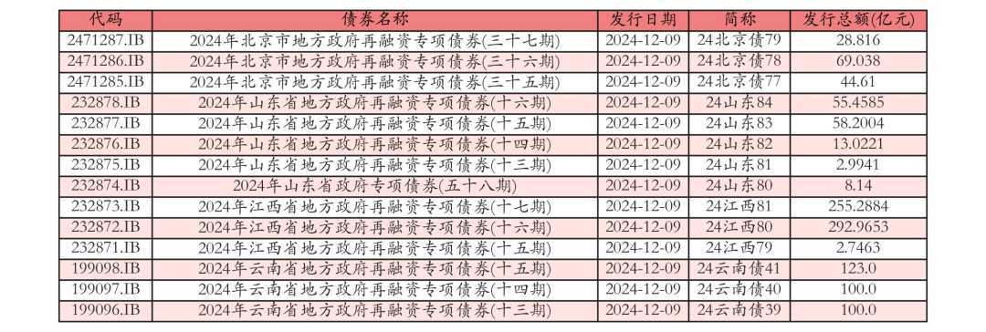 在发行的这些地方政府债券中,24云南债41、24北京债78、24山东83及24江西80的发行规模位居前列。具体而言,24云南债41的发行金额达到了123.0亿元,24北京债78为69.038亿元,24山东83为58.2004亿元,而24江西80更是高达292.9653亿元。