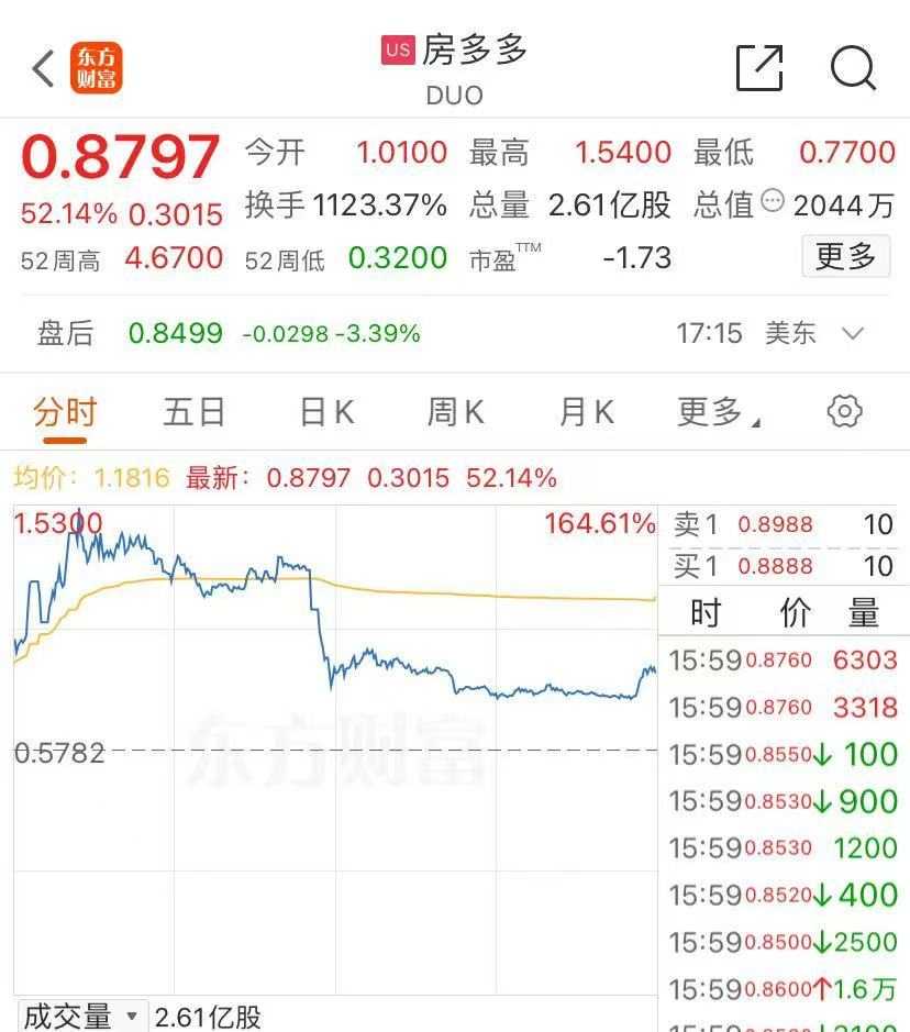 房多多在盘中多次触发熔断机制,最终收盘上涨52.14%。