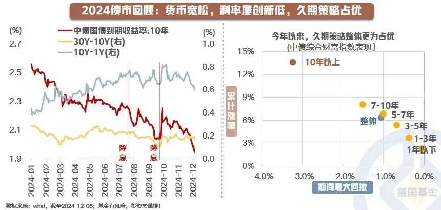 股市风格在政策转向前后也发生显著变化,从红利股转向科技股。与此同时,债市则在“资产荒+有效需求不足+货币宽松”的组合拳下,走出了一轮牛市行情。一季度,债市交易极致,久期拉长,逼空上涨;二季度,央行提示风险,债市区间波动;下半年,增量政策出台,债市波动加剧,降息预期引领下呈现震荡下行后快速回调的态势。