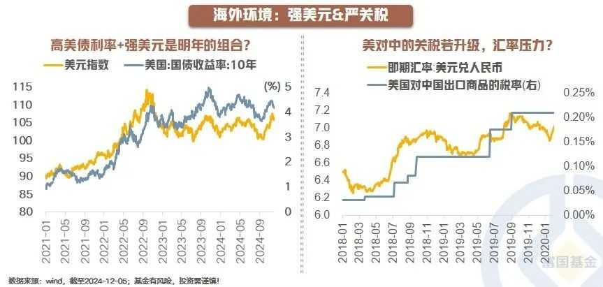 展望2025年,海外方面需关注美元和关税两大因素。美元或继续维持强势,特朗普2.0的政策组合可能强化美国经济,支撑美元。但中长期看,美国高财政赤字和高付息成本或加速去美元化进程。关税方面,特朗普2.0主张掐断中国商品“借道出海”通道,可能成为全球供应链重塑的敏感变量。
