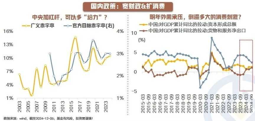 国内方面,2025年政策将聚焦财政和消费。自“924”一揽子增量政策出台后,国内政策方向已转向更加积极,中央加杠杆空间打开,广义赤字率有望进一步抬升。消费方面,扩消费政策加码既是主观意愿也是客观要求,需大力提振消费以扩大国内需求。