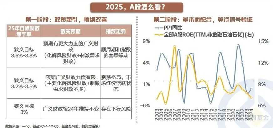对于2025年股市,政策发力将带来短期提振,但盈利向上才是长期关键。A股将在预期与现实的碰撞中前行,呈现“两阶段走”节奏。第一阶段,政策窗口期,政策预期发酵;第二阶段,政策成效验证期,若有效需求改善,则盈利成为核心逻辑。