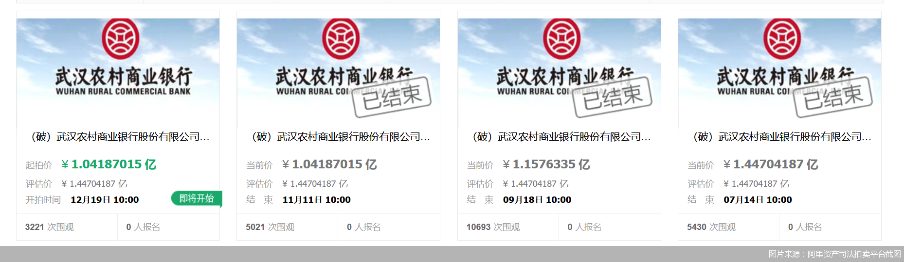 此外,武汉上善至高置业集团有限公司持有的武汉农商行2932.88万股股权也将于同日开拍,起拍价为6698.41万元。此笔股权也曾在10月30日登上拍卖平台,但因故被撤回。除武汉农商行外,山西银行、广安农商行、广东顺德农商行等多家银行的股权也迎来拍卖。