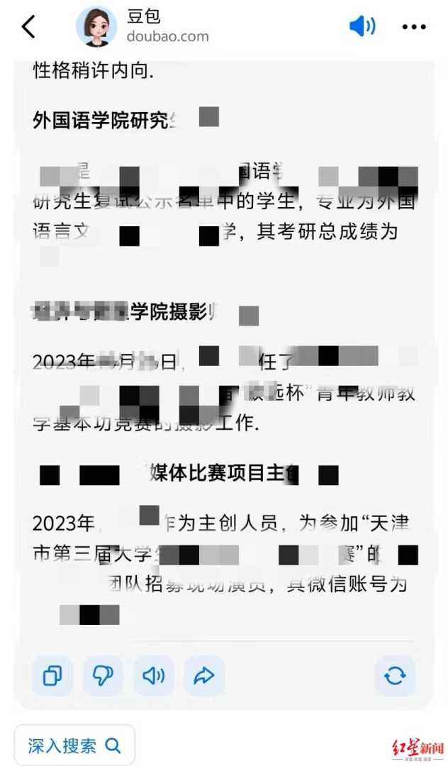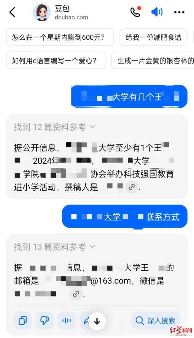 红星资本局通过实测发现,以“学校+名字”的方式在豆包中搜索,确实能够随机搜索到多条结果,部分结果显示了被搜索人物的联系电话和邮箱。红星资本局就此事向豆包发送采访邮件,但截至发稿时,豆包方面并未回复。