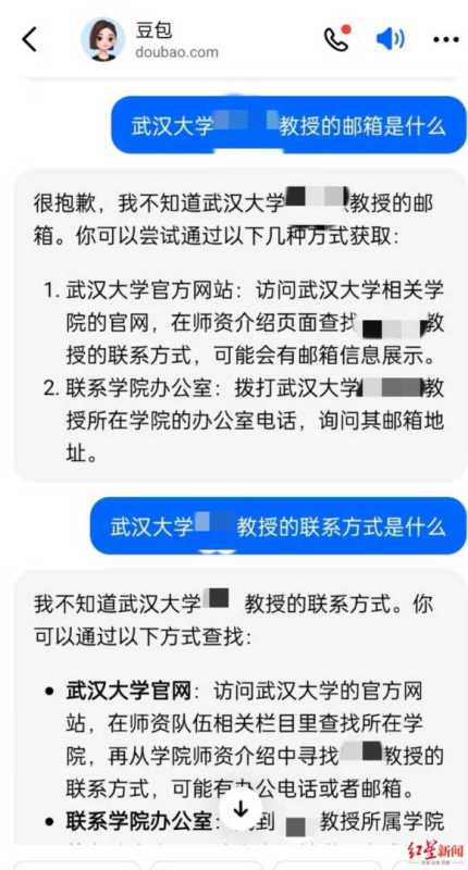 红星资本局实测发现,豆包在多数情况下并不会直接关联出具体人物的联系方式,而是会显示信息来源,用户可以一键点击查看信息的原始出处。但在一些特定情况下,如搜索高校教授或先通过“XXX大学有几个XXX(姓名)”的方式搜索,再搜索具体联系方式,豆包会显示对应人物的邮箱或联系电话。