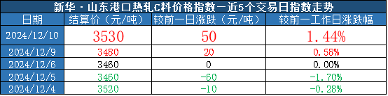 同样值得关注的是,新华·山东港口热轧C料价格也呈现出上涨态势,截至12月10日报3530元/吨,较前一日上涨50元/吨,涨幅为1.44%。这一变化进一步证明了当前大宗商品市场的活跃性。