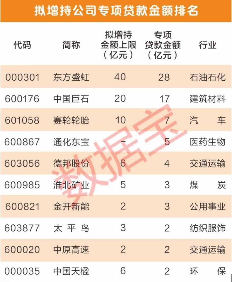 值得注意的是,在发布增持预案的上市公司中,有29家公司表示资金来源包括专项贷款。如东方盛虹获得建设银行、农业银行、中国银行等合计28亿元的贷款支持;中国巨石则获得中国农业银行最高9亿元的专项贷款支持。数据显示,拟增持金额上限在1亿元以上的48家公司中,已有22家取得银行出具的《贷款承诺函》。