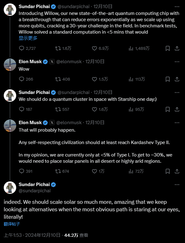 消息一出,连科技巨头特斯拉的CEO马斯克都惊叹不已,他在社交媒体上回复了谷歌CEO桑达尔·皮查伊的推文,用“Wow”一词表达了自己的惊叹之情。皮查伊则回应称,有一天他们应该用星际飞船(Starship)在太空中做一个量子集群。马斯克随后也打开了话匣子,他写道:“任何有自尊的文明都至少应该达到卡尔达肖夫 II 型文明。在我看来,我们现在甚至还未达到 I 型文明的5%。”