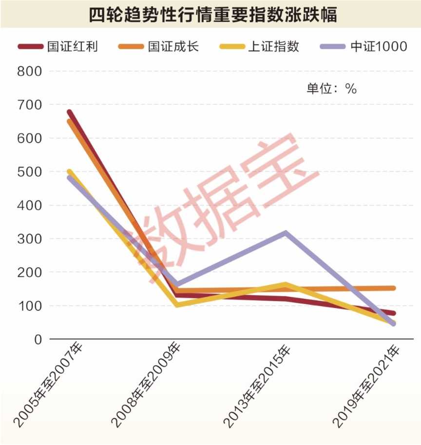 数据显示,红利指数有机会跑赢成长指数,且波动风险更低。在四轮趋势性行情中,红利指数与成长指数各有千秋。此外,红利资产内部存在结构分化,不同板块在不同趋势性行情中的表现各异。部分红利板块如有色金属、煤炭等,在过往行情中多次领涨。