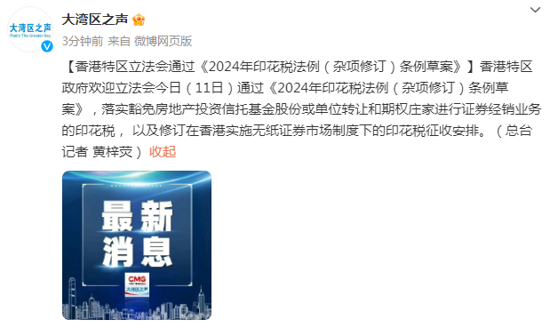 香港特区立法会通过印花税法修订草案,豁免REITs股份或单位转让印花税及期权庄家证券经销业务印花税,修订无纸证券市场印花税征收安排,旨在优化营商环境,提升市场活跃度。