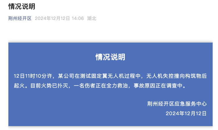 12月12日,湖北荆州经开区一家公司在测试固定翼无人机时,无人机失控撞向构筑物后起火,一名伤者正在救治,事故原因正在调查中。