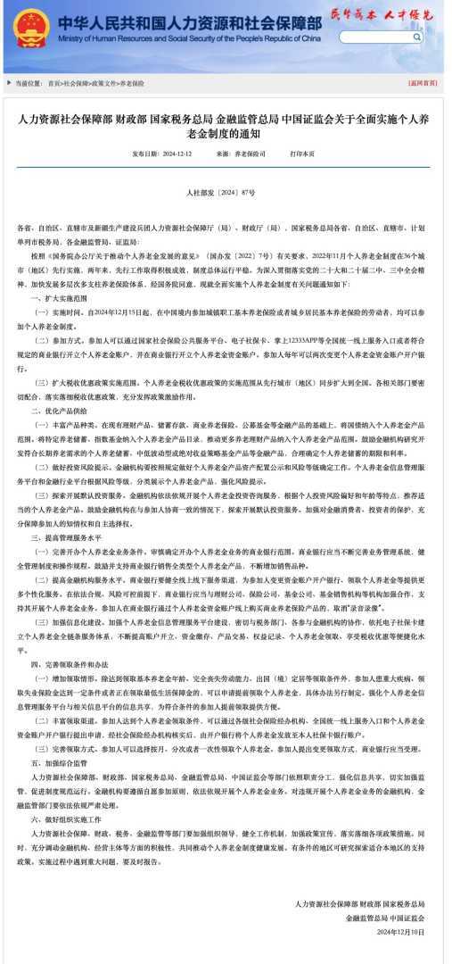 12月12日,人力资源和社会保障部、财政部、国家税务总局、金融监管总局以及中国证监会联合发布了《关于全面实施个人养老金制度的通知》(下文简称《通知》)。《通知》对个人养老金制度进行了全面阐述,明确了扩大实施范围、优化产品供给、提升服务管理水平、完善领取条件和流程、强化综合监管以及确保组织实施的具体措施。