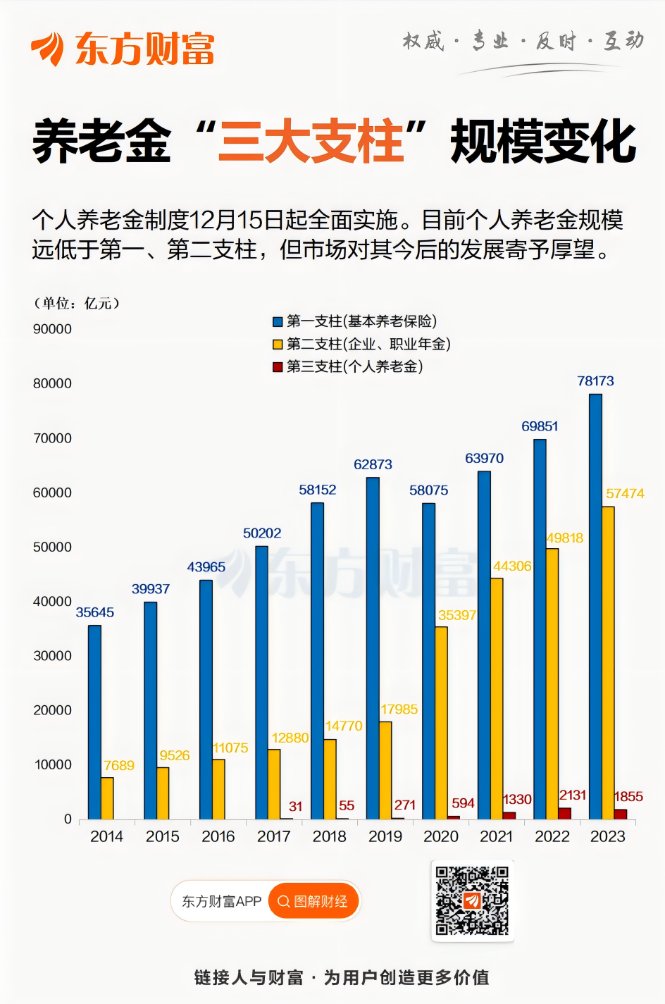 据东方财富Choice数据统计,截至2023年底,养老体系第三支柱(个人养老金)的规模仅为1855亿元,与第一支柱(基本养老保险,7.82万亿元)和第二支柱(企业、职业年金,5.75万亿元)相比,显得相对较小。然而,随着个人养老金制度的全面推广实施,市场对其未来发展寄予厚望,期待养老金体系的“三大支柱”能够在未来实现并驾齐驱。