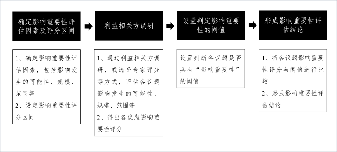 对于“双重重要性”的分析,笔者建议:一是从长清单议题中梳理出具有优先排序管理、行动或有所回应的议题清单;二是以尽职调查为工作程序,贯穿全面识别、与利益相关方直接沟通、后续分析和影响评估等环节;三是关注五个关键词(4W1H),即何时开始识别(WHEN)、从什么ESG主题开始(WHERE)、如何识别利益相关方(WHOM)、如何将披露要求转化为评分机制(HOW)、怎么理解和管理重要性矩阵(WHAT)。