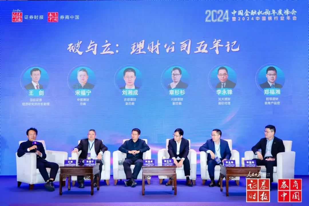 近日,证券时报社在深圳举办了“2024中国金融机构年度峰会暨2024中国银行业年会”。在《破与立:理财公司五年记》的圆桌对话中,中银理财总裁宋福宁、农银理财党委委员刘湘成、兴银理财副总裁章杉杉、光大理财副总经理李永锋、招银理财首席产品官郑福湘齐聚一堂,共同回顾了银行理财一次转型五年的历程,并探讨了二次转型中如何展现韧性。