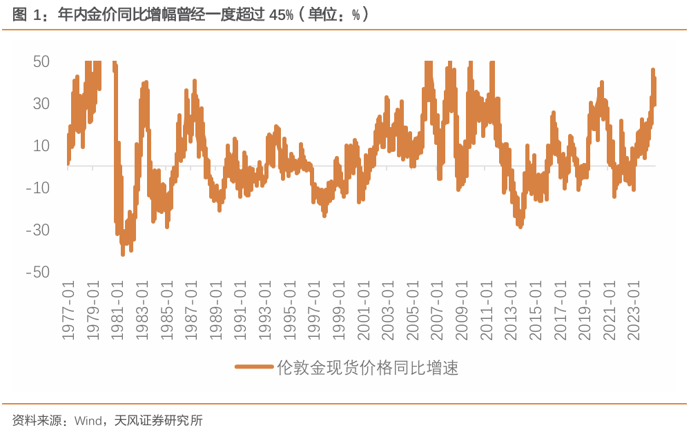 今年,黄金延续了自2022年四季度以来的牛市(参考《2024金价还能不能再创新高?》,2024年2月29日)。年内金价同比增幅一度超过45%,上一次如此涨幅还要追溯到2011年美联储量化宽松时期。