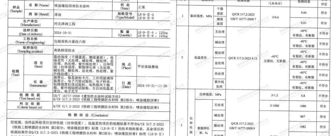 10月31日,举报人在施工现场对喷涂橡胶沥青防水涂料进行了取样,并送至权威检测机构进行检测。检测结果显示,该样品所检项目的拉伸性能(拉伸强度)和低温柔性项目的检测结果不符合Q|CR 517.2-2023《铁路工程喷膜防水材料第2部分:喷涂橡胶沥青》标准(LR-B-II)的技术指标要求。
