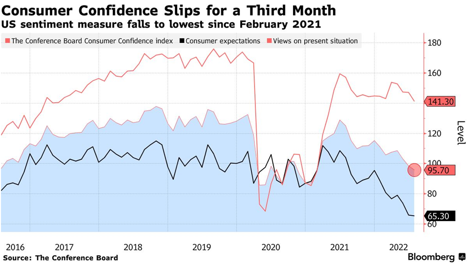 美国7月谘商会消费者信心指数创2021年2月以来新低(图片来源:彭博社)