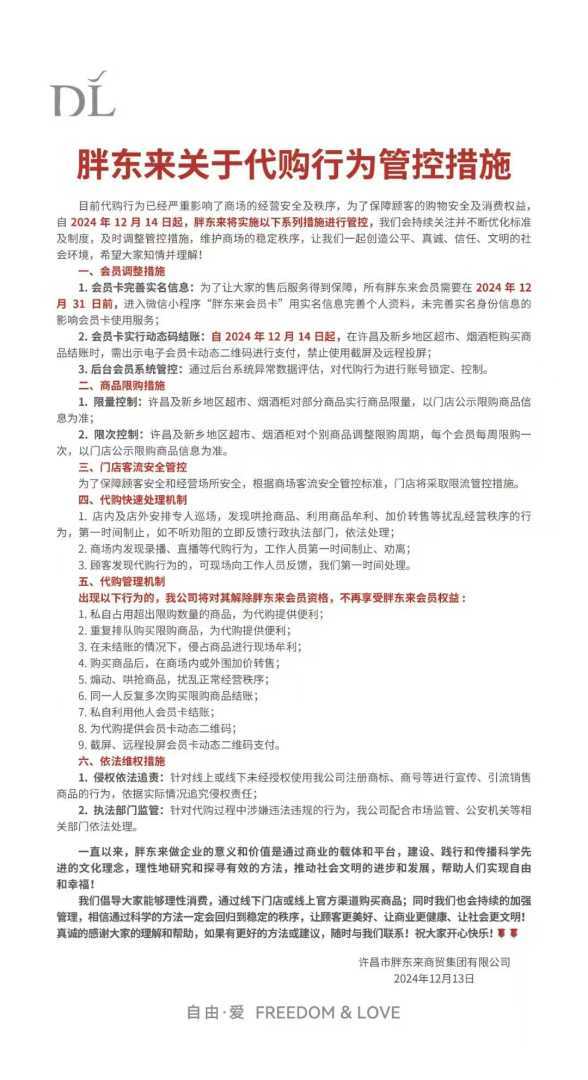 12月14日凌晨,胖东来商贸集团官方微信号发布了一项针对代购行为的严格管控措施。该措施旨在维护商场经营安全及秩序,应对代购行为带来的负面影响。