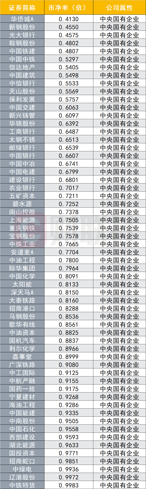 根据财联社的最新统计,截至当前交易日收盘,已有59家上市央企出现破净现象。其中,华侨城A、新钢股份、光大银行、鞍钢股份、中国铁建等多家公司的市净率低于0.5倍。以下是详细的破净央企名单: