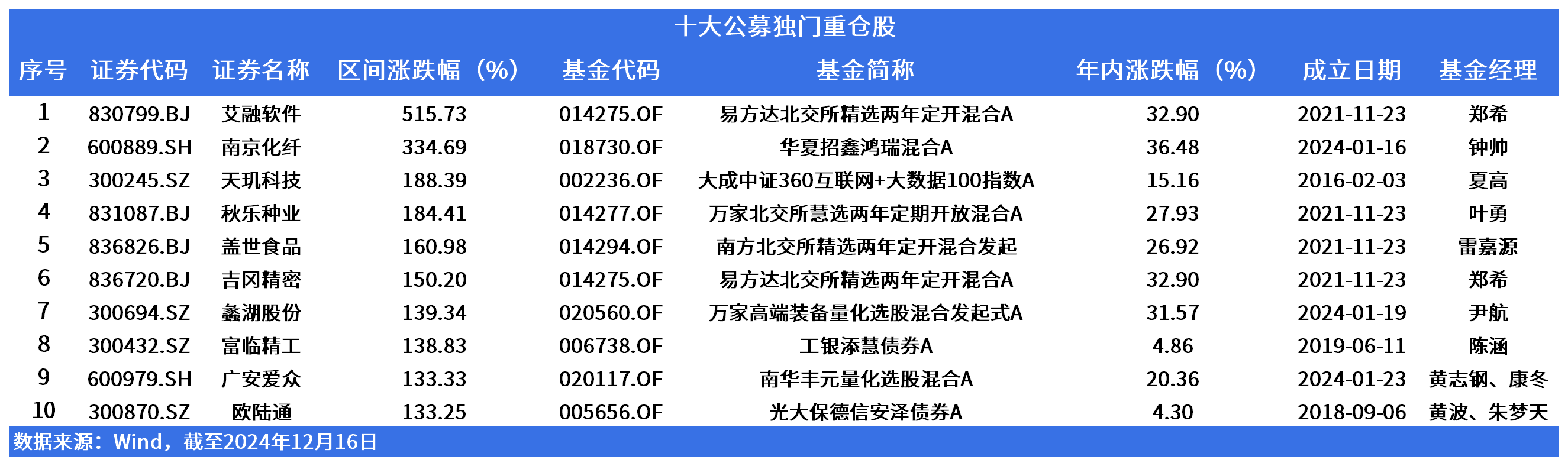 自“924行情”以来,A股市场行情持续火热,投资者热情高涨,政策利好频出,市场信心显著增强。公募基金三季报及Wind数据显示,截至2024年12月16日,在仅被一只基金重仓的股票中,艾融软件(830799.BJ)以515.73%的区间涨幅位居榜首,由郑希管理的易方达北交所精选两年定开混合A基金是唯一重仓该股票的公募基金产品,年内涨幅达32.90%;同时,该基金重仓的吉冈精密(836720.BJ)区间涨幅达138.83%,也跻身十大公募独门重仓股榜单。