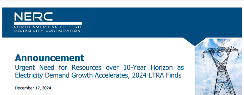 在NERC的2024年长期可靠性评估报告中,明确指出“随着需求增长持续飙升以及火力发电机退役计划的实施,未来10年北美大部分地区(大容量电力系统)将面临越来越大的资源充足性挑战。”