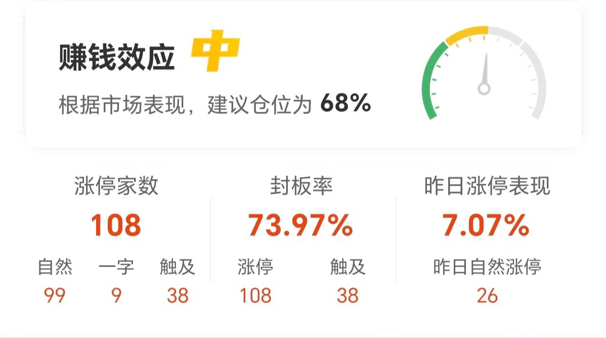 个股涨停情况方面,今日市场共计108只个股涨停,另有38只个股一度触及涨停,整体封板率达到73.97%。