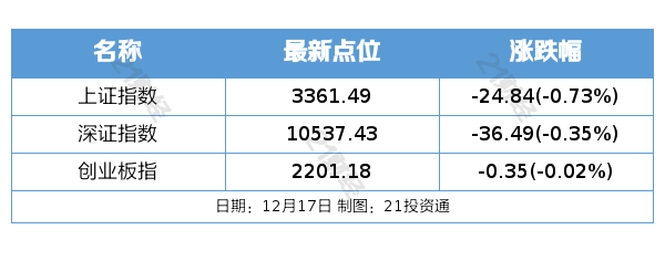 12月17日,A股市场收盘,三大指数呈现震荡下行趋势,上证指数收跌0.73%,深证成指收跌0.35%,创业板指微跌0.02%;北证50指数则收跌3.22%。全天市场冲高后回落,大小盘股走势出现分化,微盘股指数大幅下跌近6%。