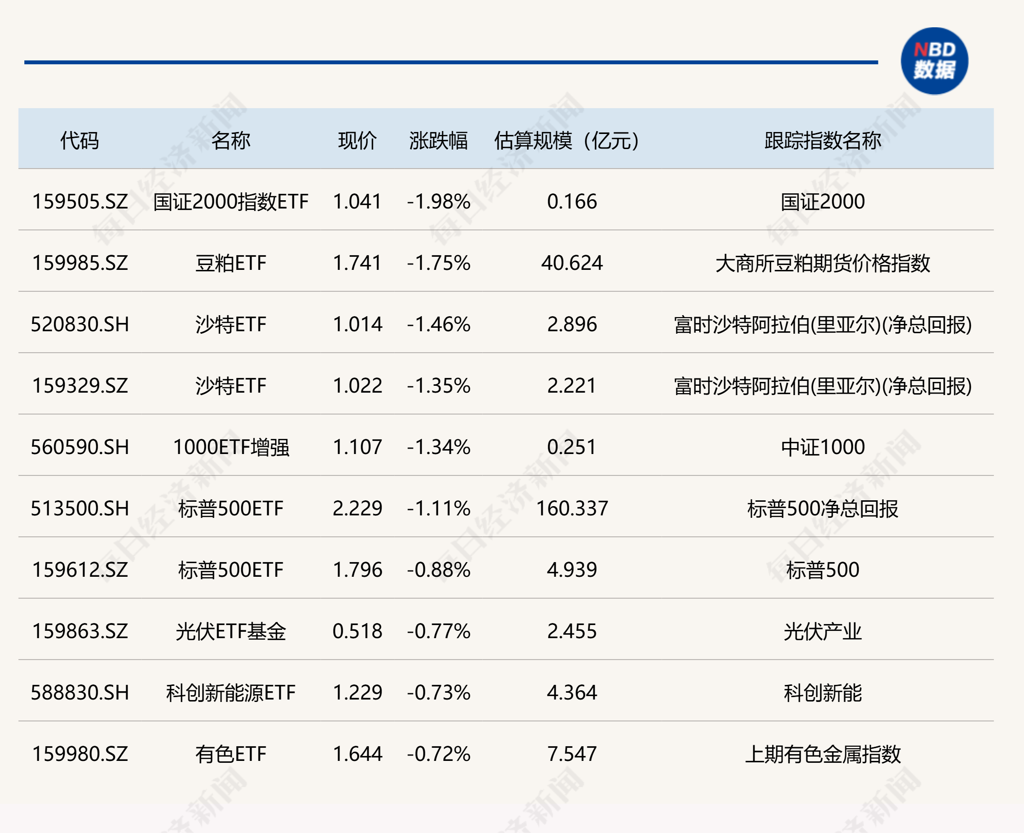 然而,在下跌方面,国证2000、豆粕等相关ETF跌幅较大,市场资金对这些领域的态度相对谨慎。此外,沙特等ETF也跌幅居前,显示出国际市场对相关地区的经济前景存在一定的担忧。