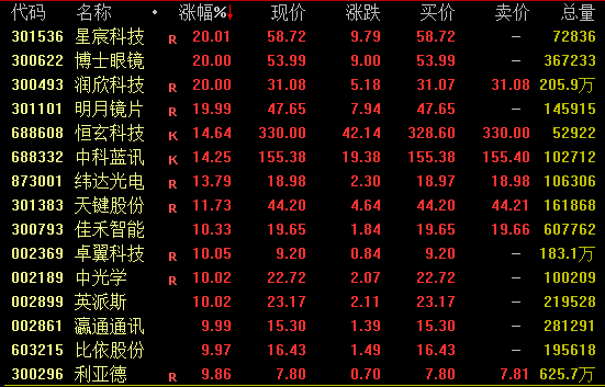 市场风格再度切换,消费板块持续回调,而主题投资则相对活跃。半导体板块表现尤为突出,星宸科技、富瀚微、安凯微等个股均以20%的涨幅涨停,寒武纪股价更是突破600元大关,创历史新高。同时,人脑工程概念股也集体爆发,诚益通、爱朋医疗等个股涨停,三博脑科涨幅超过13%。此外,AI眼镜概念股亦大幅拉升,博士眼镜、明月镜片等个股涨停。