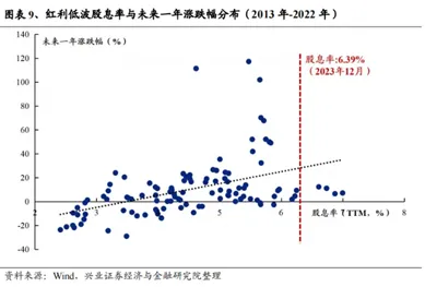 历史数据显示,股息率与红利低波资产未来一年的市场表现相关性较高,股息率提升时,未来潜在的股价收益率也随之提高。(来源:兴业证券)