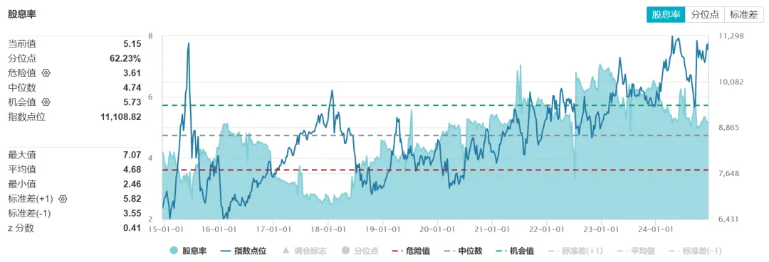 尽管红利资产的超额收益已持续三年多,但判断其未来投资价值时,需考虑价格空间。以中证红利低波动指数(代码:H30269)为例,其当前股息率为5.15%,仍处于近十年中枢水平之上,显示出良好的投资性价比。