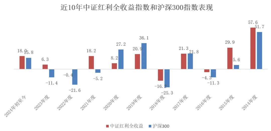 高分红意味着公司具备长期稳定的盈利能力和现金流,带来确定的长期回报。近十年来,中证红利全收益指数和沪深300指数的年度表现显示,红利风格在震荡行情中展现良好的防御性和抗跌性,在市场上行期和牛市行情中也保持稳定上涨。