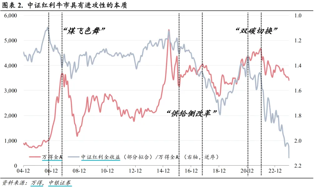 在三轮全A指数从底部向上的区间中,高股息相关权重行业表现占优,相对收益大幅跑赢。
