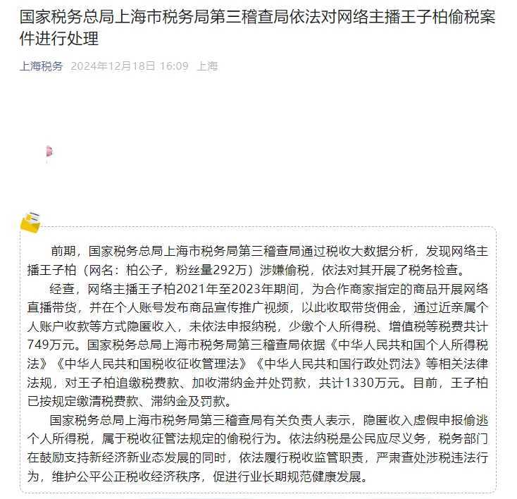 据上海税务12月18日发布的消息,国家税务总局上海市税务局第三稽查局利用税收大数据分析,发现网络主播王子柏(网名:柏公子,拥有292万粉丝)涉嫌偷税行为,随即依法对其展开了详细的税务检查。
