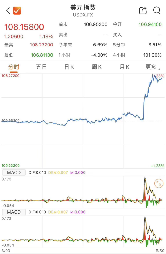 此外,美国10年期国债收益率大幅走高,升破4.5%;美元指数站上108关口,刷新2022年11月以来新高;非美货币集体下挫,离岸人民币对美元失守7.32关口,英镑对美元、欧元对美元也均大幅下跌。