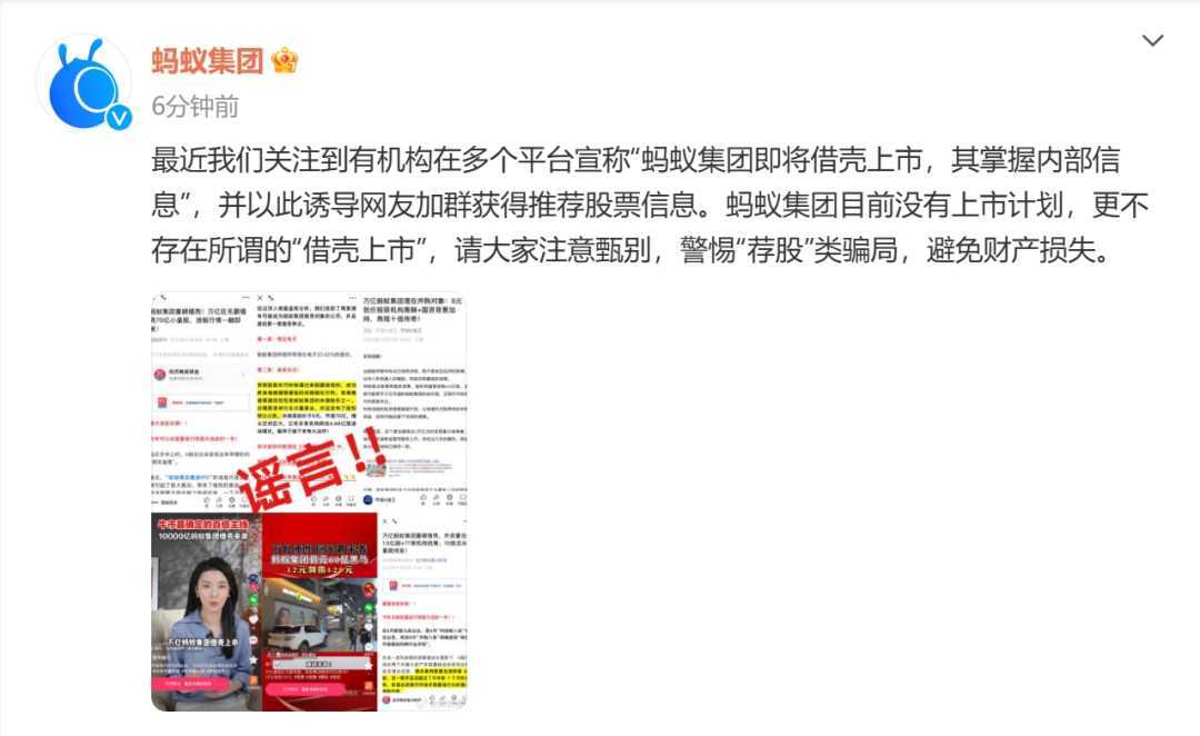 每经AI快讯,12月19日,蚂蚁集团在其官方微博发布正式声明,针对近期网络流传的“蚂蚁集团即将借壳上市”的传闻进行了明确澄清。声明指出,有部分机构在多个平台上散布虚假信息,声称掌握了蚂蚁集团内部上市计划,并以此为由诱导网友加入群聊,进而推荐股票信息。