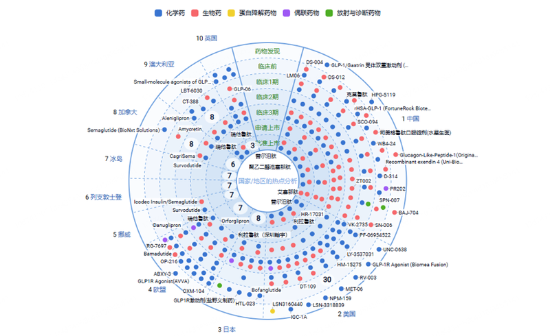智慧芽新药情报库供图:靶点GLP-1R领域的全球研发进度top10的国家/地区热点分析(图中散点代表不同药物)
