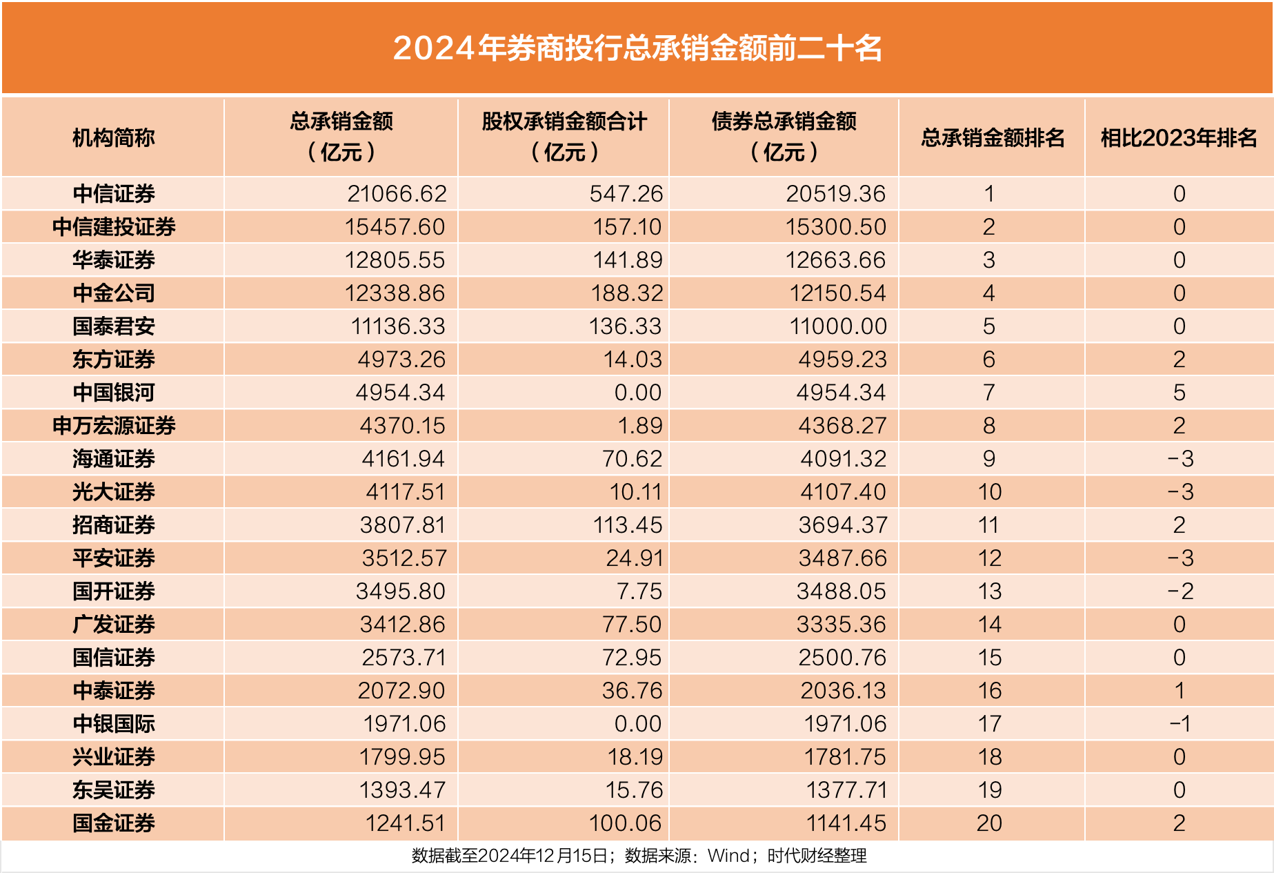 2024年券商投行总承销金额前二十名。图表来源:时代财经