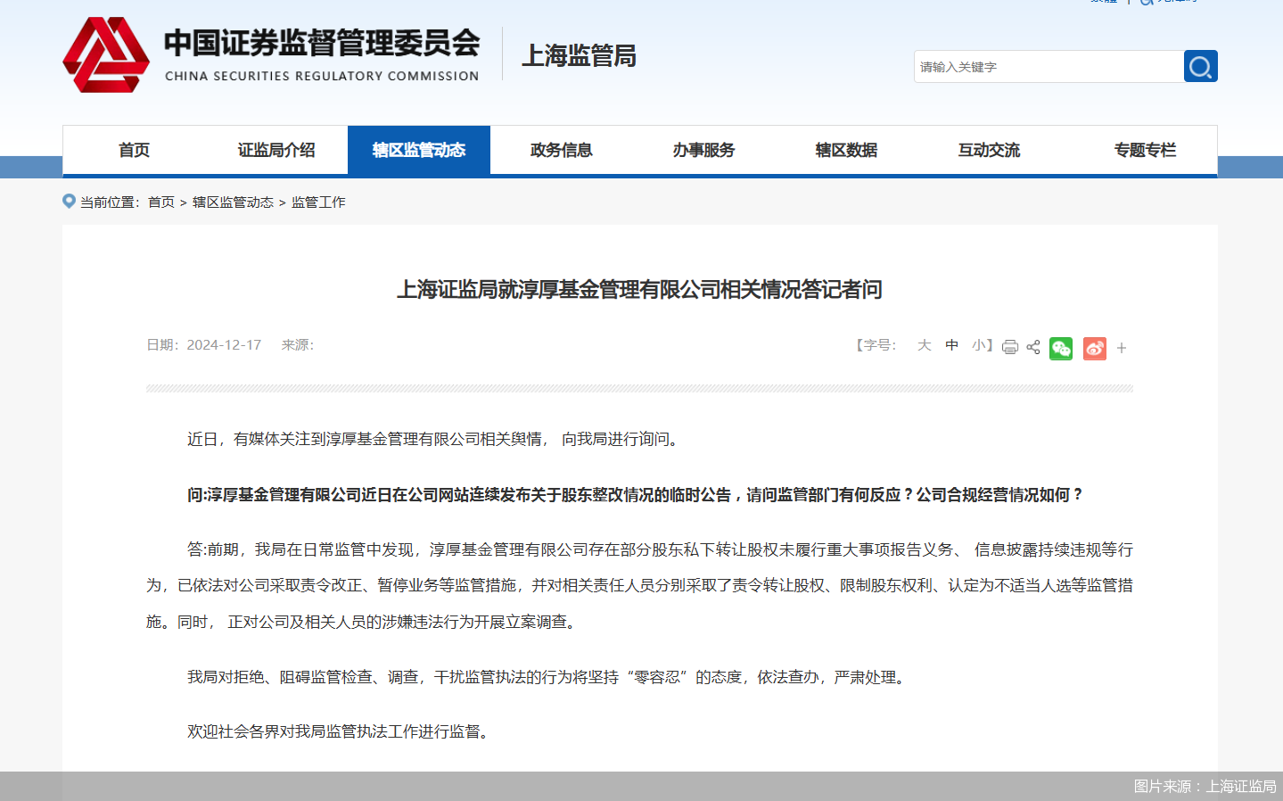 淳厚基金近期陷入舆论风波,市场传言其不配合上海证监局调查,拒绝监管人员进入办公楼。上海证监局对此表示,对拒绝、阻碍监管的行为将坚持“零容忍”态度,依法查办。此事源于淳厚基金股东整改未完成,涉及股东私下转让股权未履行报告义务、信息披露违规等行为。上海证监局已对公司采取责令改正、暂停业务等监管措施,并对相关责任人采取监管措施,同时对公司及相关人员的涉嫌违法行为开展立案调查。