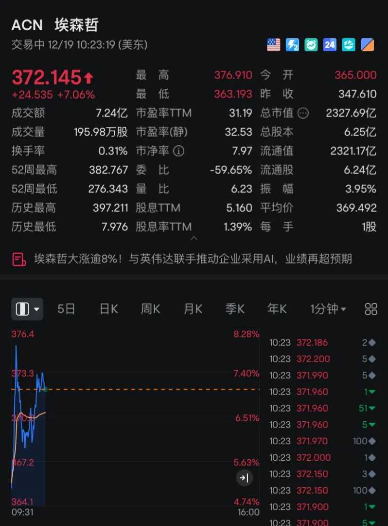 在美股市场上,加密货币概念股在开盘后表现强劲,多只个股涨幅超过5%。此外,全球知名IT服务公司埃森哲在盘前公布业绩后股价大涨超过7%,得益于其生成式人工智能相关业务的强劲增长。