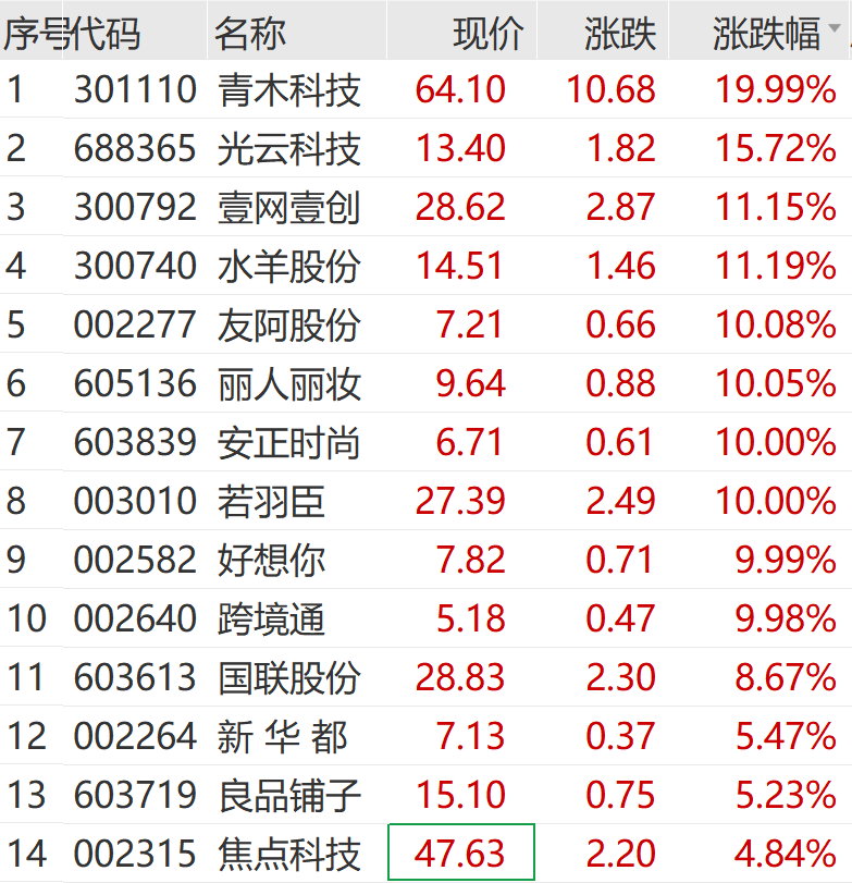 具体来看,商贸零售板块强势反弹,电子商务、跨境电商等概念走高。个股中,青云科技20CM涨停,若羽臣、安正时尚、丽人丽妆等多股涨停。此外,拼多多合作商概念股也走高,元隆雅图、返利科技双双涨停。食品股方面,皇氏集团、紫燕食品、来伊份、盐津铺子、好想你等多股涨停。