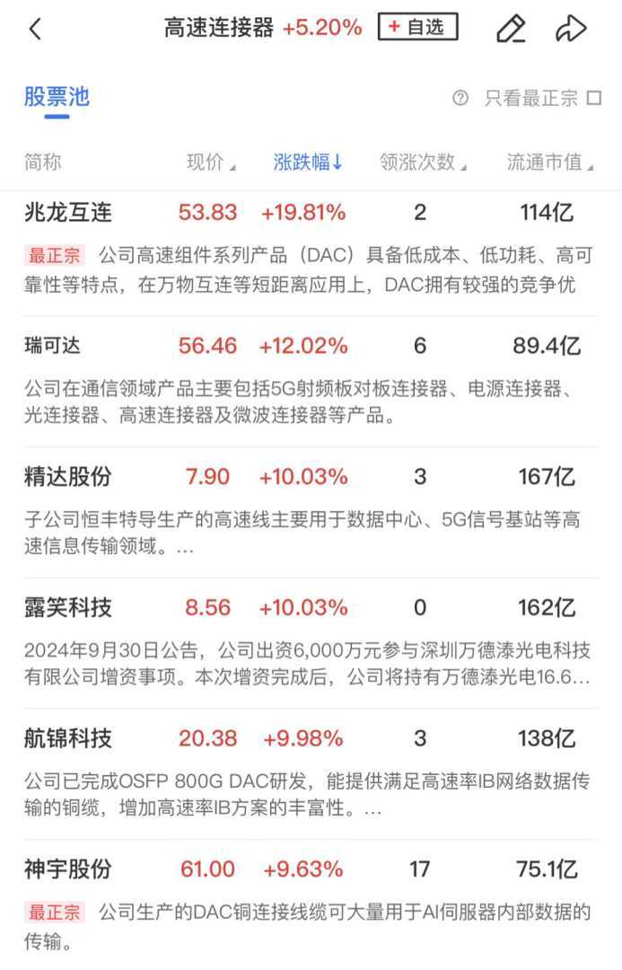 此外,铜高速连接概念也涨幅居前,精达股份、露笑科技涨停,兆龙互联涨超19%,瑞可达、裕太微、神宇股份、沃尔核材等个股同样涨幅居前。光大证券指出,随着谷歌、博通、AWS、微软等科技巨头趋向于用自研ASIC以及以太网架构组网,有源铜缆的需求将迎来高增长,且这一趋势有望至少持续2-3年。