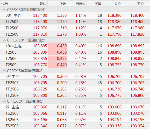 债券市场利率的持续下行,推动了国债期货市场的全线走高。截至收盘,各期限国债期货的涨幅依旧显著。