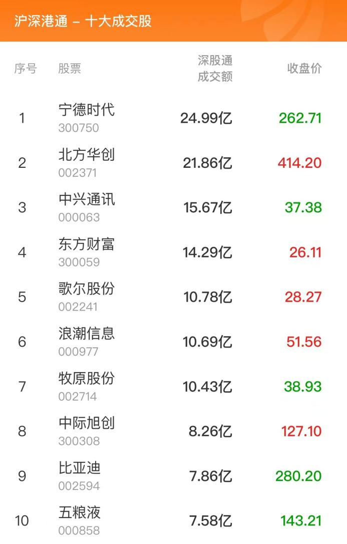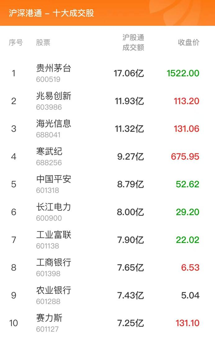 在陆股通十大成交股方面,贵州茅台以其17.06亿元的成交额稳居沪股通榜首,兆易创新、海光信息紧随其后,成交额分别为11.93亿元和11.32亿元。在深股通方面,宁德时代以24.99亿元的成交额领跑,北方华创和中兴通讯分别位列第二、第三,成交额分别为21.86亿元和15.67亿元。