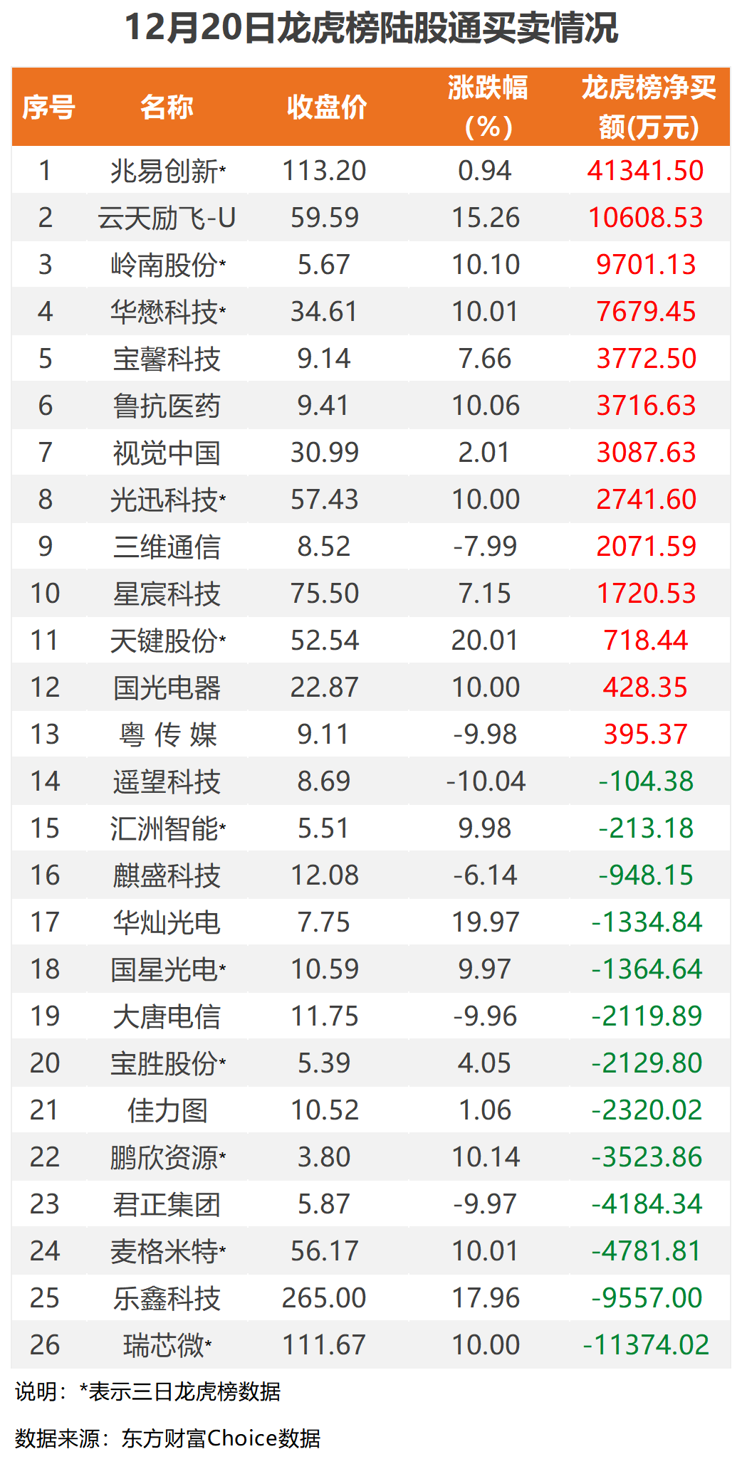 12月20日北向资金成交活跃,十大成交股及龙虎榜揭晓