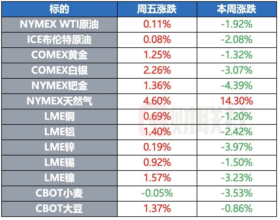 在商品市场方面,WTI 2月原油期货结算价微涨0.08美元,涨幅0.11%,报69.46美元/桶,但本周累计下跌1.92%。布伦特2月原油期货同样微涨0.06美元,涨幅0.08%,报72.94美元/桶,本周累计下跌2.08%。