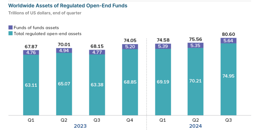 全球受监管的开放式基金总规模持续增长,截至三季度末,已达到了74.95万亿美元,较二季度末增长了6.8%。这一数据由ICI在官网发布,覆盖了44个司法管辖区,包括一般公募基金、ETF和机构基金。