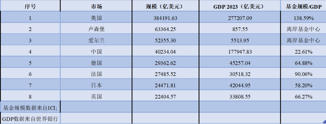 最后,从各国受监管的开放式基金规模与其GDP的比例来看,美国的比例最高,达到了138.59%;而中国的比例为22.61%,仍有较大的发展空间。
